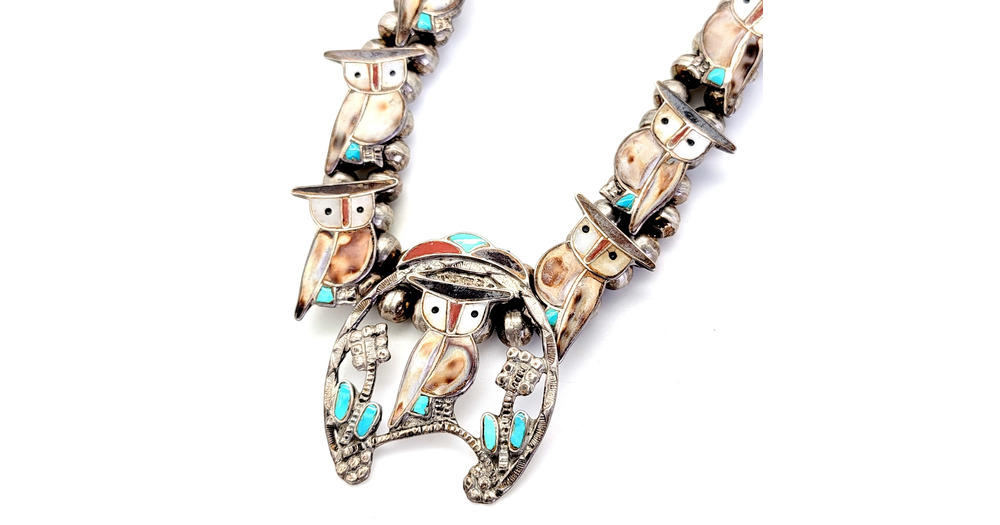 Wonderous Owls Zuni Inlay Shell Silver Turquoise MOP Vintage Native American Handmade Necklace