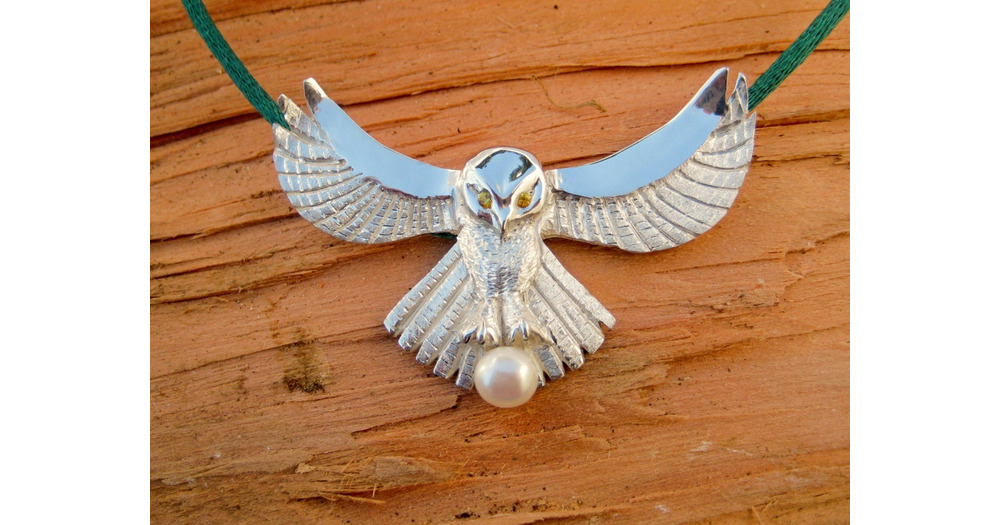 A "Fly me to the moon..." Owl pendant featuring gem eyes and pearl "catch" in th