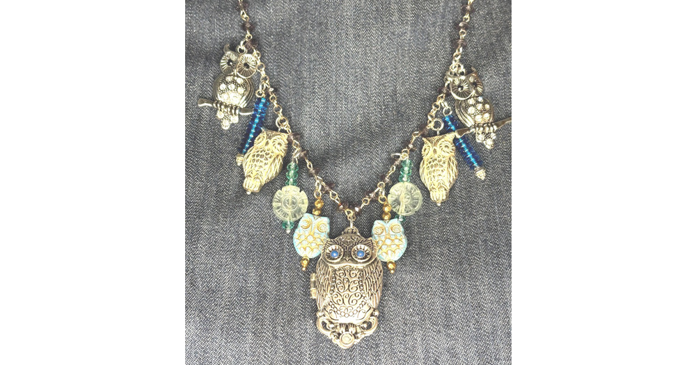 Aqua Owl Charm Pendant Necklace: Czech Glass Dangles, Vintage Vibe