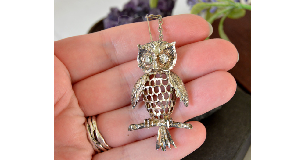 Vintage owl necklace, Silver tone metal owl carved and with openwork, Woodland pendant