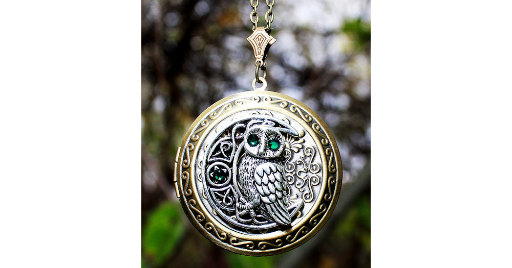 Owl Moon Locket Necklace: Emerald Swarovski Crystals, Celestial Jewelry