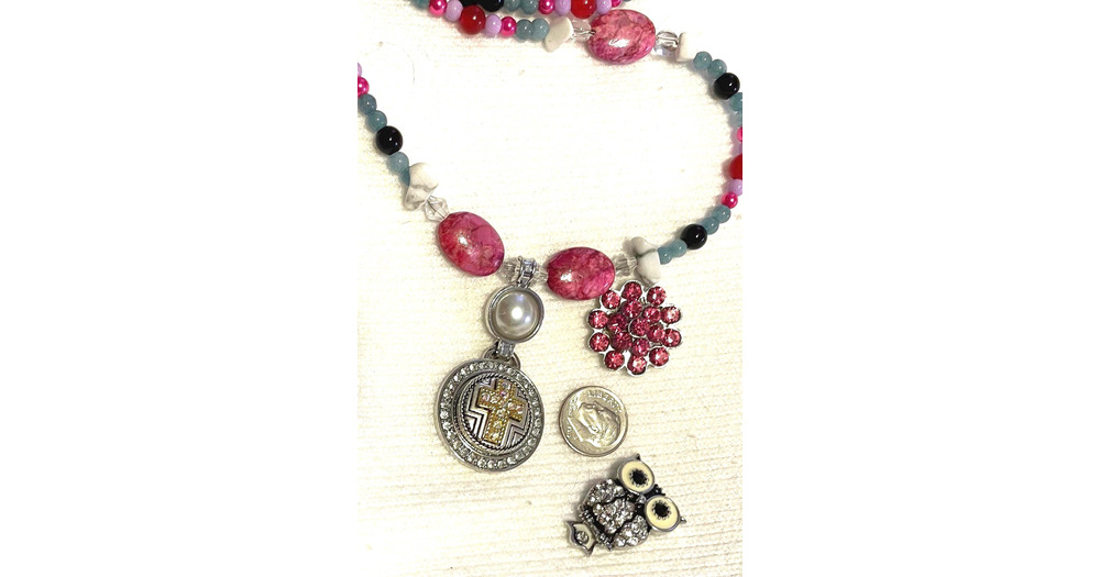Long Beaded Necklace with Interchangeable Snaps – Owl, Cross, Rhinestone
