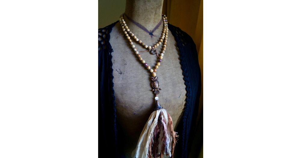 Owl Artisan Mala Necklace, Mala Beaded Necklace, Sari Silk Tassel Necklace, Nature Inspired Mala, De