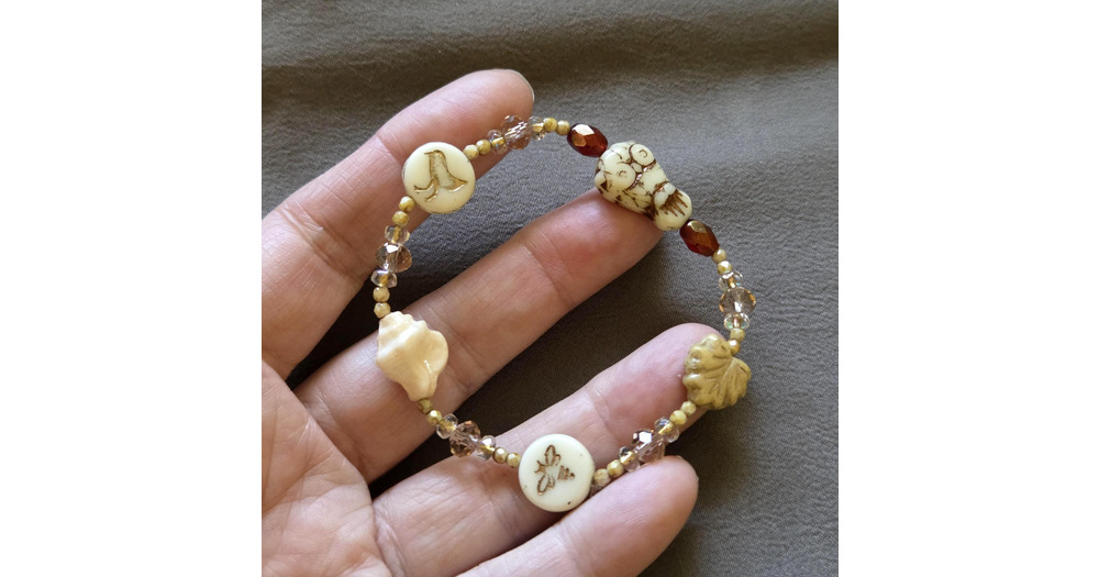 Cream Owl, Seashell, Bird, Bee Bracelet: Czech Glass. Red Accents. Size S/M 6.75"