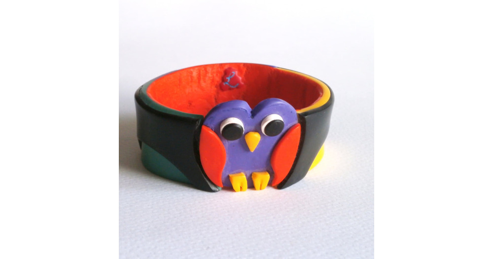 Owl bracelet for young girl polymer clay purple orange black yellow green whimsy colorful owl bangle