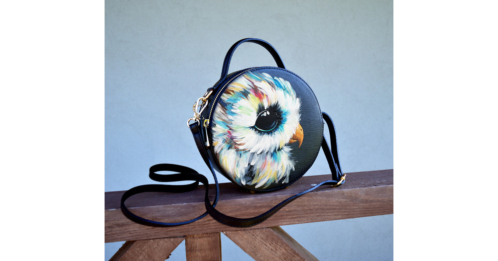 Round leather purse Owl wallet crossbody Leather messenger bag black Hand painted