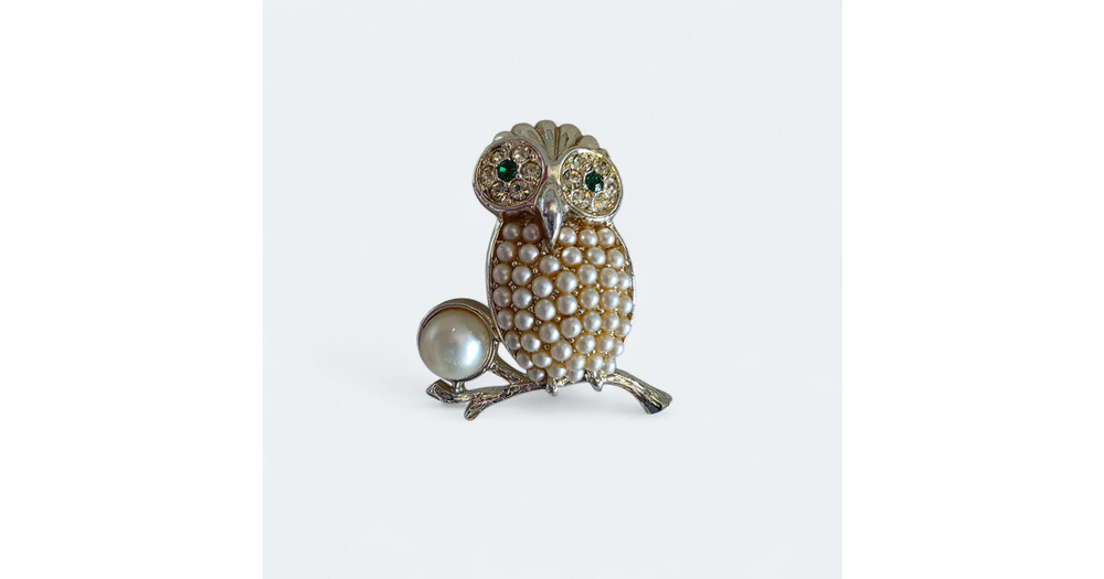 Sarah Coventry Owl Brooch Silver Toned Faux Pearls W/Rhinestones Mid Century