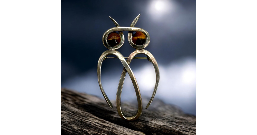 Vintage Owl Brooch Modernist Mid Century Sterling Silver Brooch Tigers Eye Brooch Love Nature Gift S