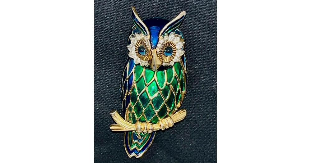 Brooch Jomaz signed owl enamel gold tone vintage rare find