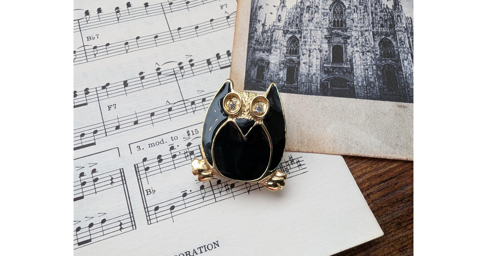 vintage black owl brooch with diamond eyes