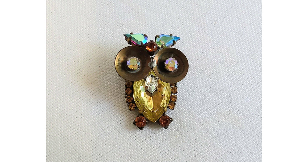 JP3192 Vintage Brass/Gold Toned Owl Brooch. Coloured Stone Accents. c1950s