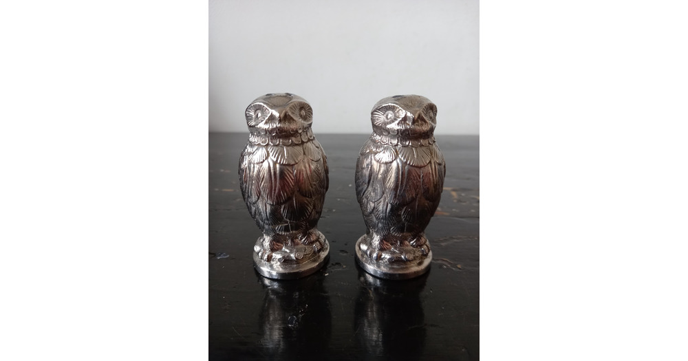 Rare Mid Century Zoomorphic Silver Plated Metal Owl Figurine Salt&Pepper Shakers in the style of