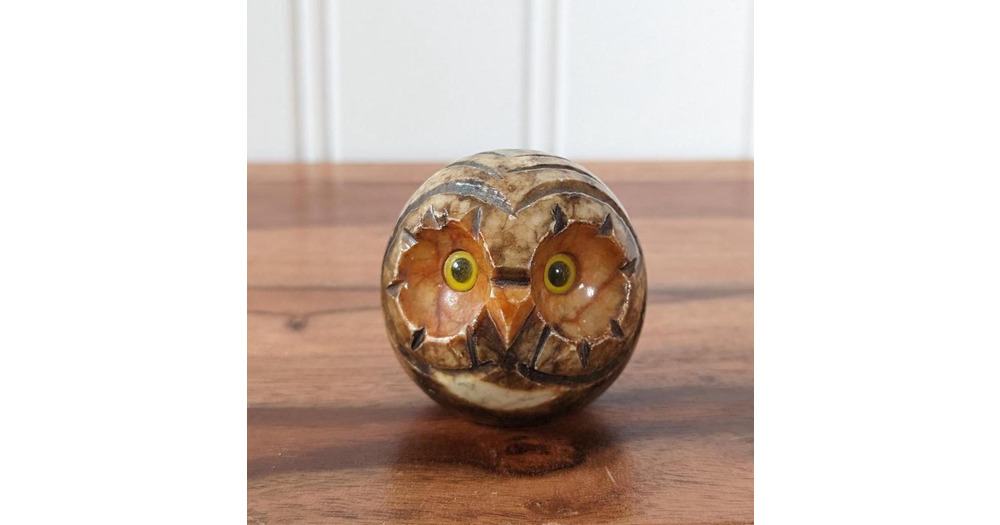 Mid Century Alabaster Round Carved Owl Paperweight, Hand Carved, Likely 1960s