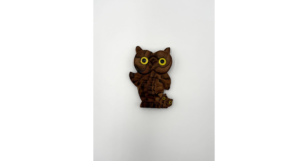 Vintage Hand Carved Wooden Owl with Baby Figurine Yellow Eyes