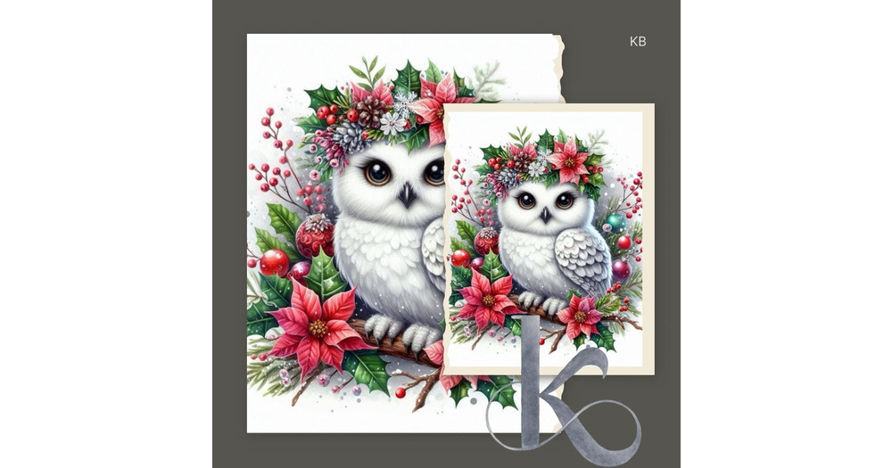 Winter Owl with Poinsettia Crown: Christmas Scrapbooking Image (Digital Download)