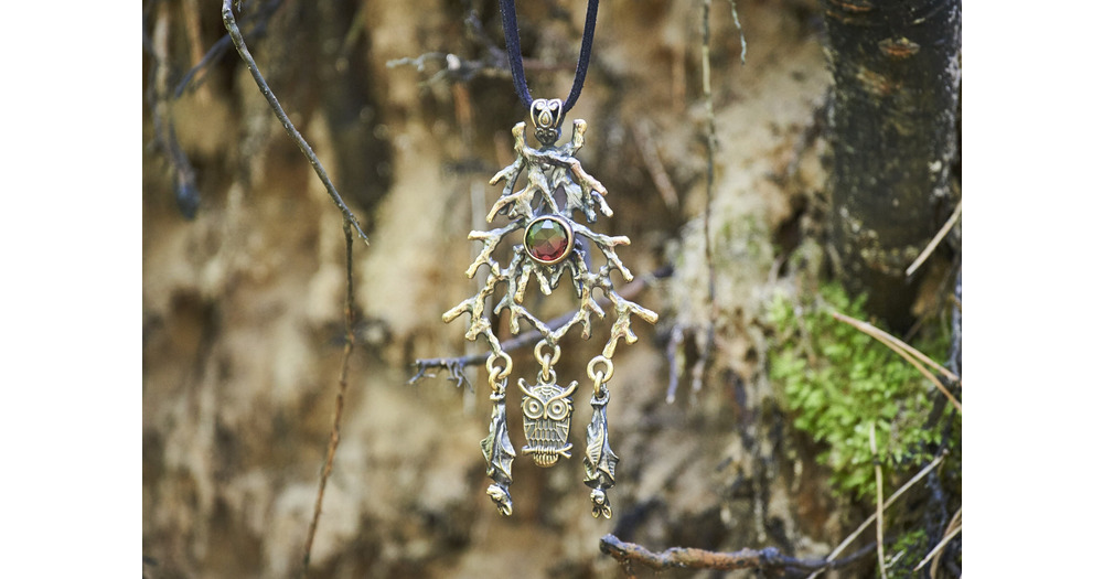Handcrafted Bronze Owl & Bats Pendant: Citrine Gothic Necklace