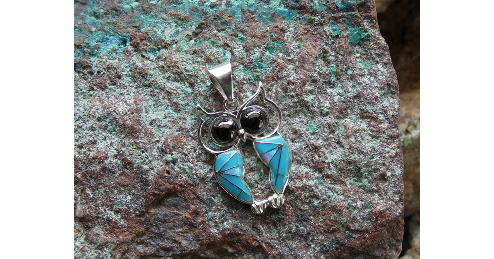 Cute Wise Owl Blue Turquoise Gemstone & Opal With Onyx Eyes Handcrafted Sterling Silver Pendant