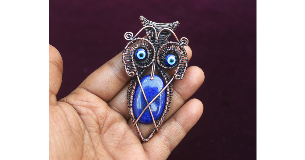 Lapis Lazuli Owl Pendant: Copper Wire Wrapped Gemstone Jewelry