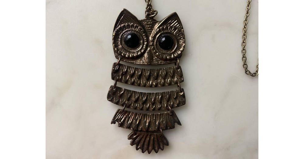 A large and striking vintage bronze articulated owl pendant and chain.