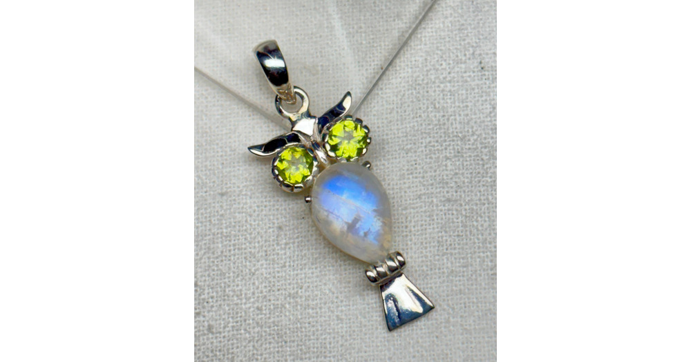 Handmade Peridot & Moonstone Owl Pendant: 925 Sterling Silver Gemstone Necklace