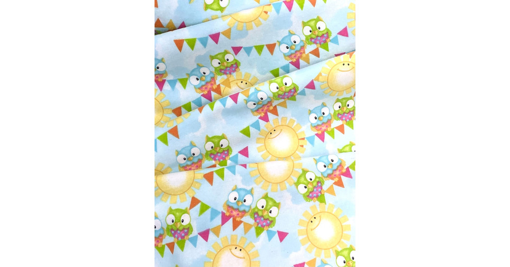 Owls on Light Blue, sunshine Comfy Cotton FLANNEL Fabric by A E Nathan, baby owls  clouds, baby blan