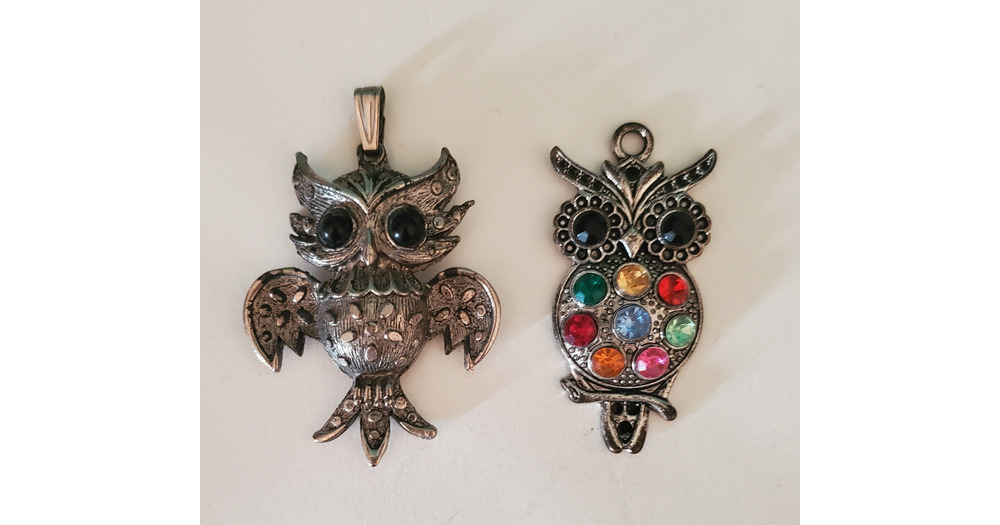 Vintage Silver Metal Owl Pendants, Black Eyes, Multicolor Stones, Lot of 2