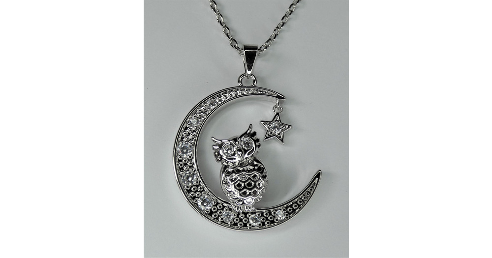Handmade Owl on Moon Pendant: Moving Star Charm, Cubic Zirconia