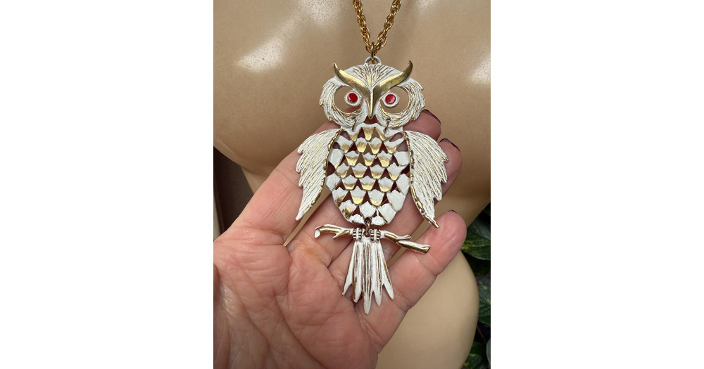 Vintage articulated white/gold owl pendant necklace, whimsical white own pendant necklace, white gol