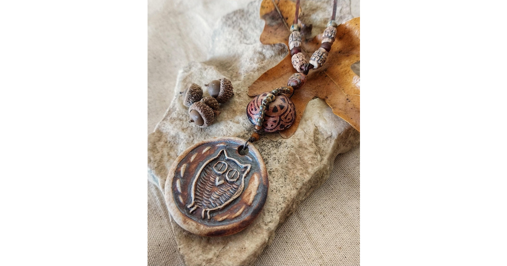 Ceramic Owl Necklace: Fall Colors, Wire Wrapped