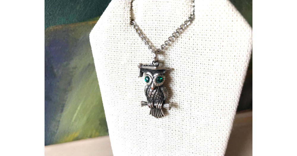Graduate Owl Pendant Necklace Green Rhinestone Eyes Wearing Mortarboard Silver Chain Choker Necklace