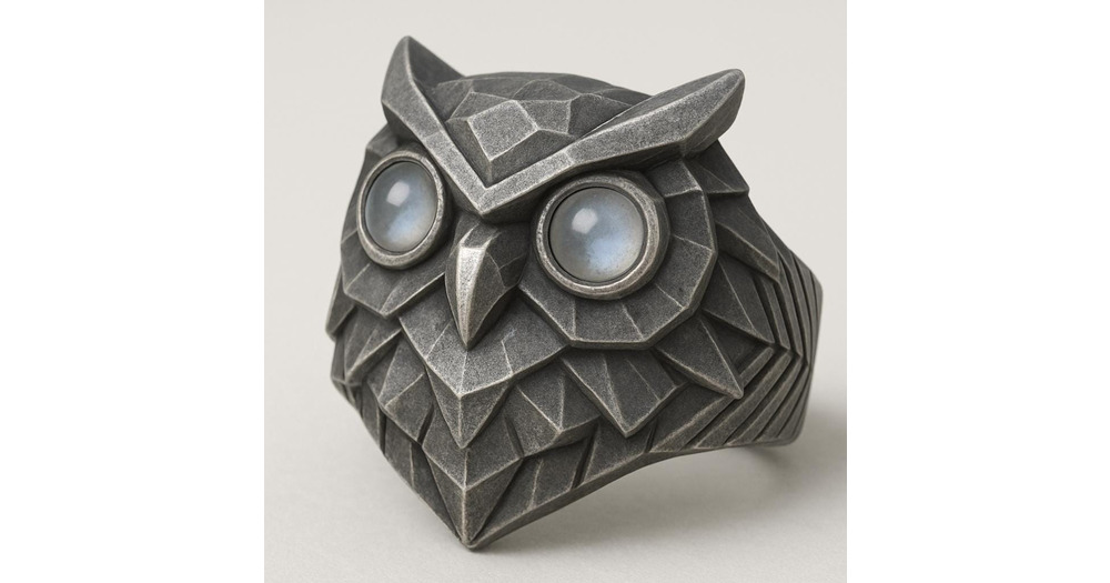 Handmade Sterling Silver Owl Ring, Rainbow Moonstone Eyes, Unisex Jewelry