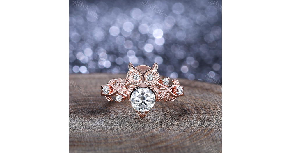 Round Moissanite Engagement Ring Unique Owl Branch Design Rose Gold Moissanite Cluster Ring Bridal P