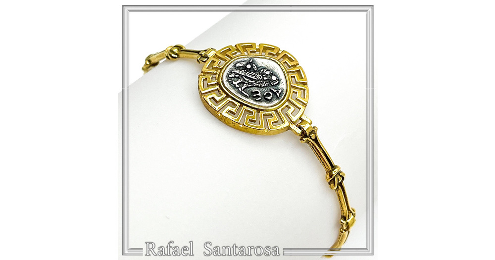 Athena Goddess Owl Tetradrachm Coin Greek Key Bracelet: Oxidized & 18k Gold Filled Sterling Silv