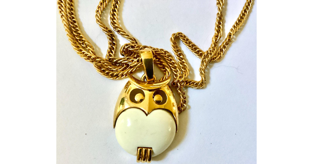 Vintage Trifari Lucite Belly Owl Pendant Marked 22 Inch Gold Tone Chain