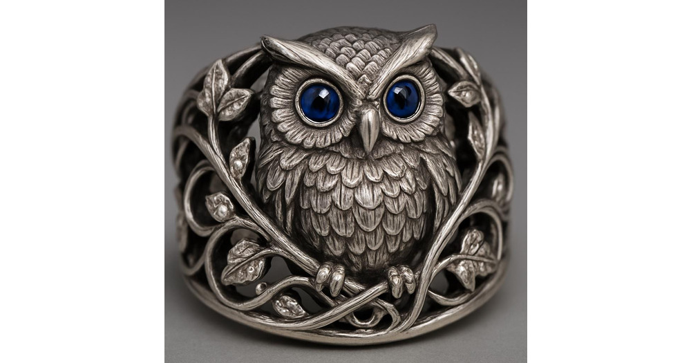 Sterling Silver Owl Ring with Blue Stone Eyes, Wide Band Statement Nature Animal Jewelry Gift for He