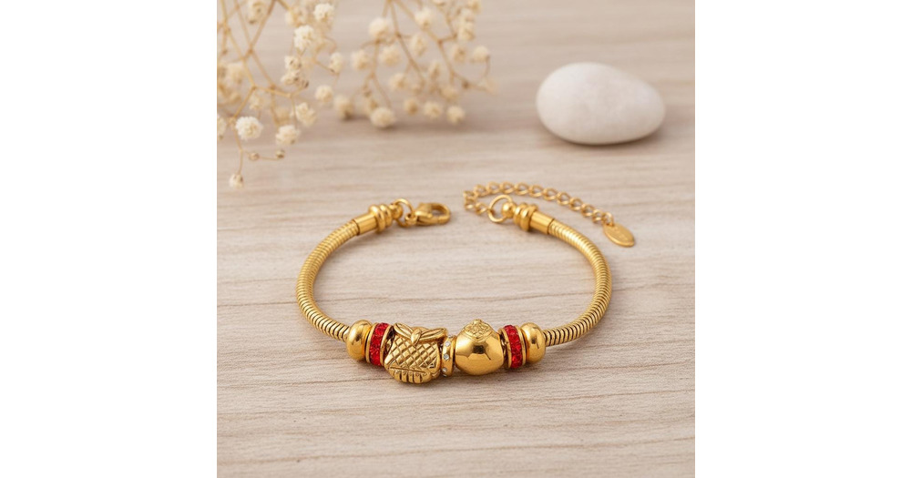 Gold Tone Snake Chain Bracelet with Owl & Heart Charms, Red Crystal Beaded Bracelet, Elegant Jew
