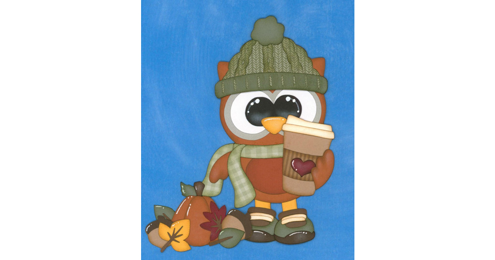 AUTUMN OWL with green hat. Fall Pumpkin Spice Latte. Scrapbook Embellishment. Handmade die cut. Pape