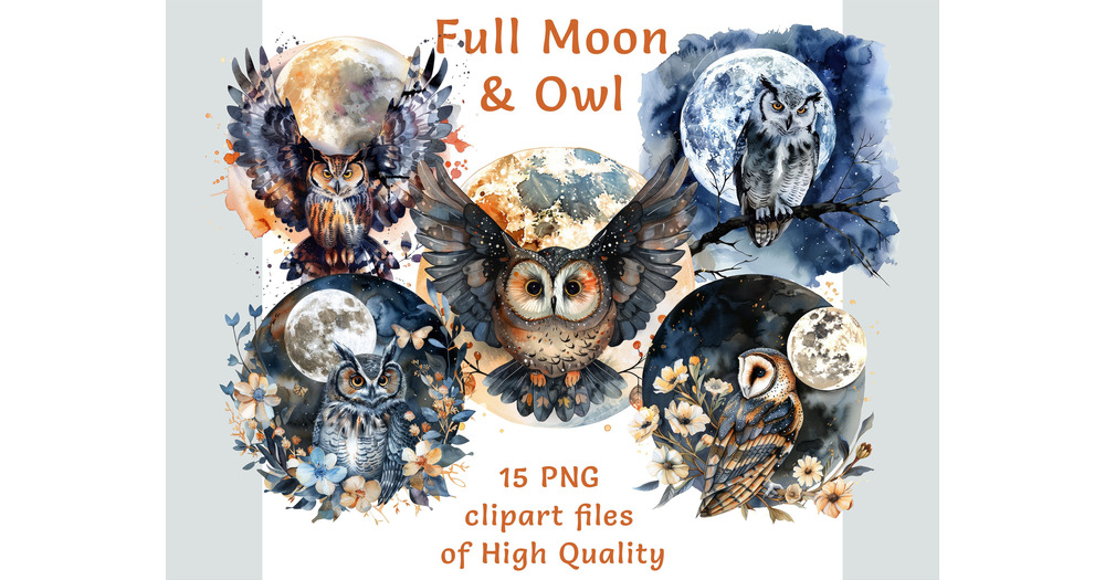 Watercolor owl clipart bundle, Moon clipart set, Sublimation print night stickers, Commercial use mi