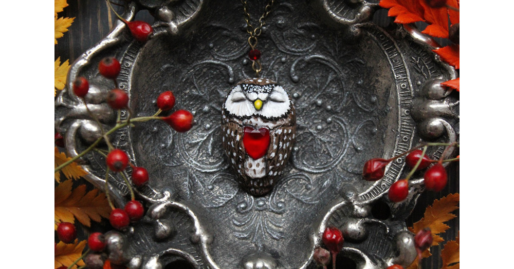 Boreal Owl With Glass Heart Necklace, Witch Owl Charm, Wicca Owl Necklace, Bird Jewelry, Athene Noct