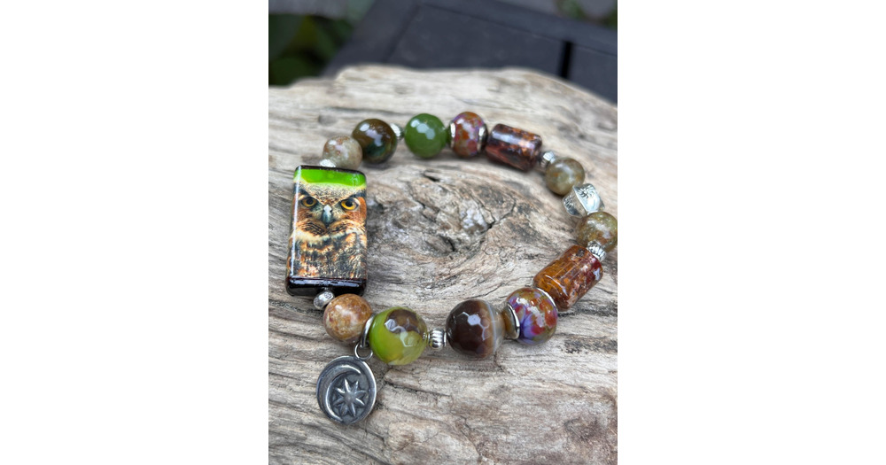 Sale Owl focal beaded stretch bracelet , nature ,boho , handmade, Harbor Girl Designs