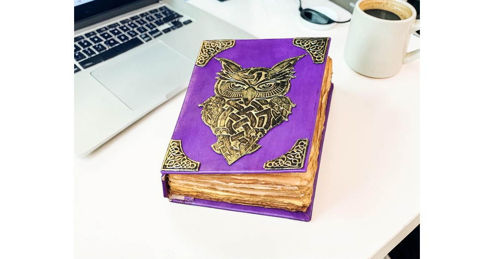 Purple Leather Owl Journal, Handmade Deckle Edge Paper Notebook, Celtic Diary