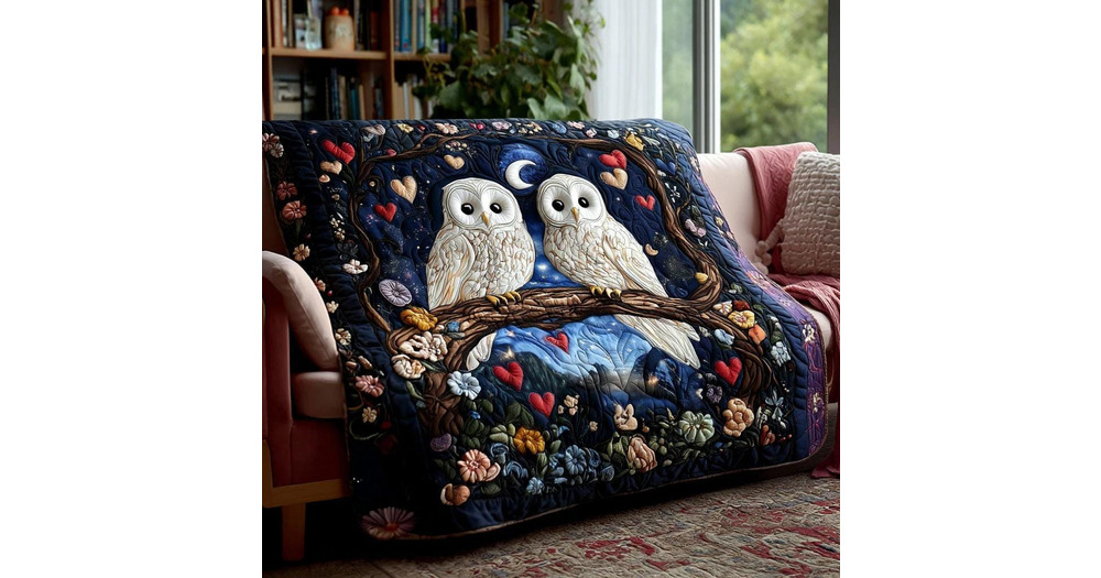 Owl Couple Lightly Quilted Blanket, Romantic Owl Quilt Throw, Night Forest Owl Bedding, Cottagecore