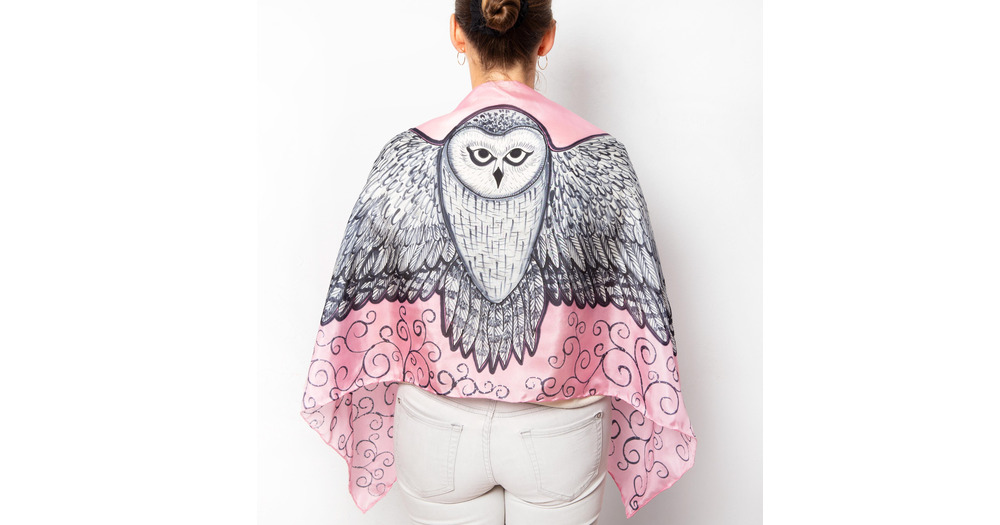 Snowy Owl Hand Painted Pink Silk Scarf Owl Wing Shawl Birthday Gift 63X20