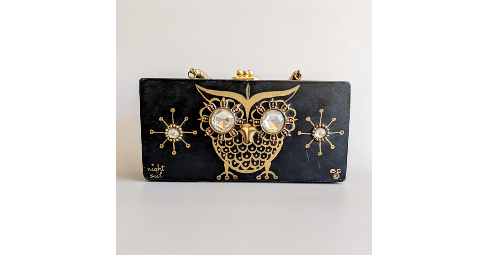 1960s Enid Collins Night Owl Wood Box Purse | Vintage 60s Novelty Purse