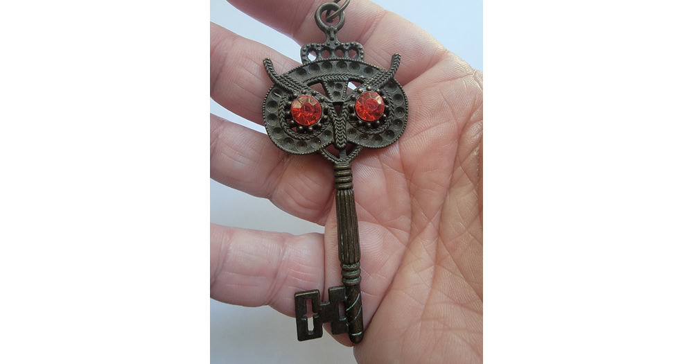 Bronze Tone Owl Key Pendant Necklace with Rhinestones