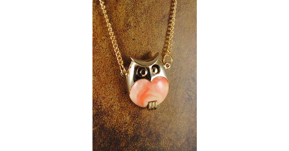 Owl Necklace Vintage Medium Size Coral Marbled and Gold Toned Owl Pendant 1960s