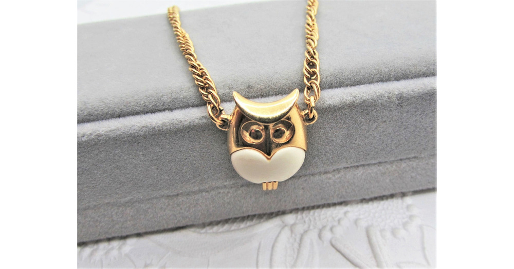Vintage CROWN TRIFARI Owl Necklace- Cream Lucite Jelly Belly Pendant- 15" Gold-Plated Choker Ch