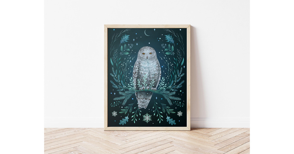 Giclée Print Poster, Snowy Owl Illustration | Moonlit Winter Botanical Scene, magical night,