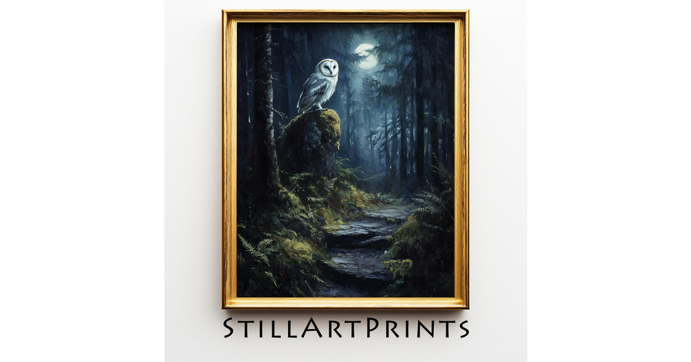 Moody Printable Barn Owl Painting - Whimsical Nocturnal Woodland Path Art, Atmospheric Moonlit Fores