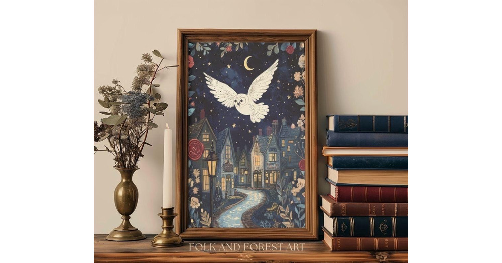 Magical Owl Wall Art Printable – Whimsical Flying Owl in Moonlight – Storybook Night Nur